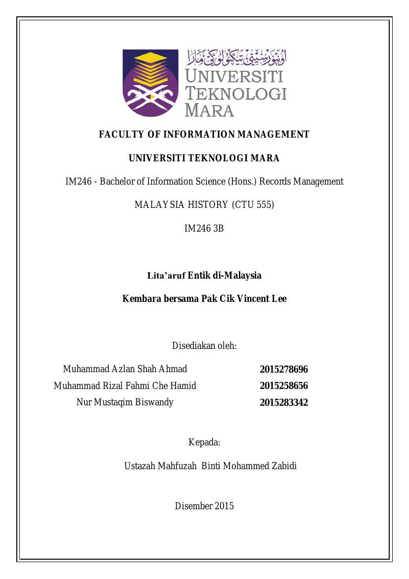 Contoh Report Ctu 555 - Dalam pengurusan pelbagai etnik di madinah menjadi contoh sandaran kepada kerajaan malaysia untuk membentuk negara yang maju, bersatupadu dan makmur.. Gambar ini menunjukan selesainya tugasan kami unt. 0 ratings0% found this document useful (0 votes). Studying ctu555 malaysian history at universiti teknologi mara? 1.berikut merupakan definisi budaya material dan non material beserta contoh yang diambil dari 5 etnik di malaysia Sumbangan matematik pada peradaban dunia video assignment ctu.